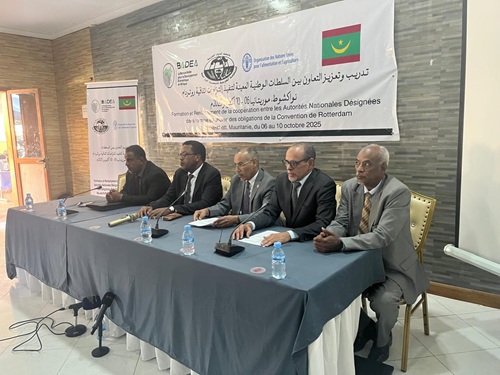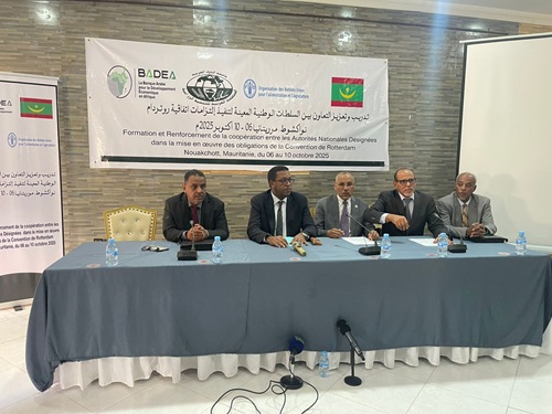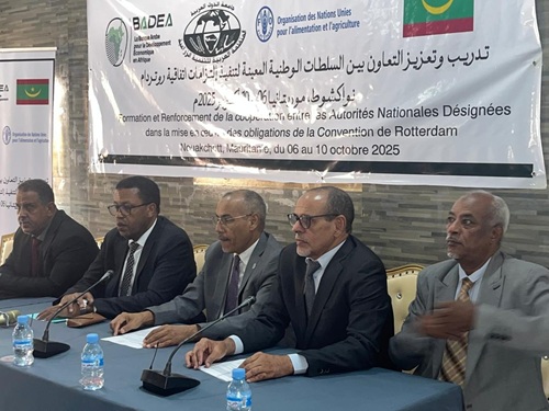 في إطار الجهود المشتركة التي يبذلها المصرف العربي للتنمية الاقتصادية في أفريقيا والمنظمة العربية للتنمية الزراعية، بالتعاون مع منظمة الأمم المتحدة للأغذية والزراعة (الفاو)، لبناء قدرات الدول الأفريقية جنوب الصحراء في مجالات التنمية الزراعية والأمن الغذائي، انطلقت صباح يوم الاثنين الموافق 6 أكتوبر 2025 في العاصمة الموريتانية نواكشوط، أعمال الدورة التدريبية الخاصة بتعزيز التعاون بين السلطات الوطنية المعنية بتنفيذ اتفاقية روتردام بشأن تصنيع واستيراد واستخدام وتداول المبيدات الكيميائية.
